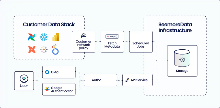 Seemore Data adheres to a zero data ingress principle. We never ingest, store, or modify customer data. Our platform interacts exclusively with metadata—strictly limited to the scope you authorize. SQL statements executed are fully visible to your team and available for audit.